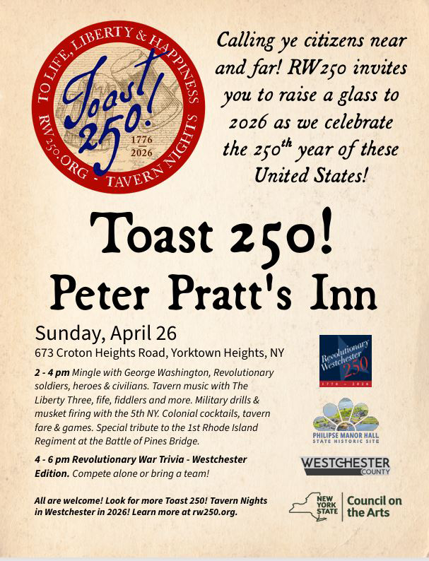 Hosted by RW250, this lively Revolutionary-era experience celebrates the semiquincentennial (1776-2026) in an authentic 18th century tavern. Enjoy tavern music and song with The Liberty Three. Meet Ben Franklin, George Washington and other living history guests. Try classic tavern games like Skittles and Shut the Box. Dance to the fiddle and fife! See Continental soldiers demonstrate their skills and drills in the field outside. End the night with the Westchester-themed, Revolutionary War trivia game. Bring your team or play alone.